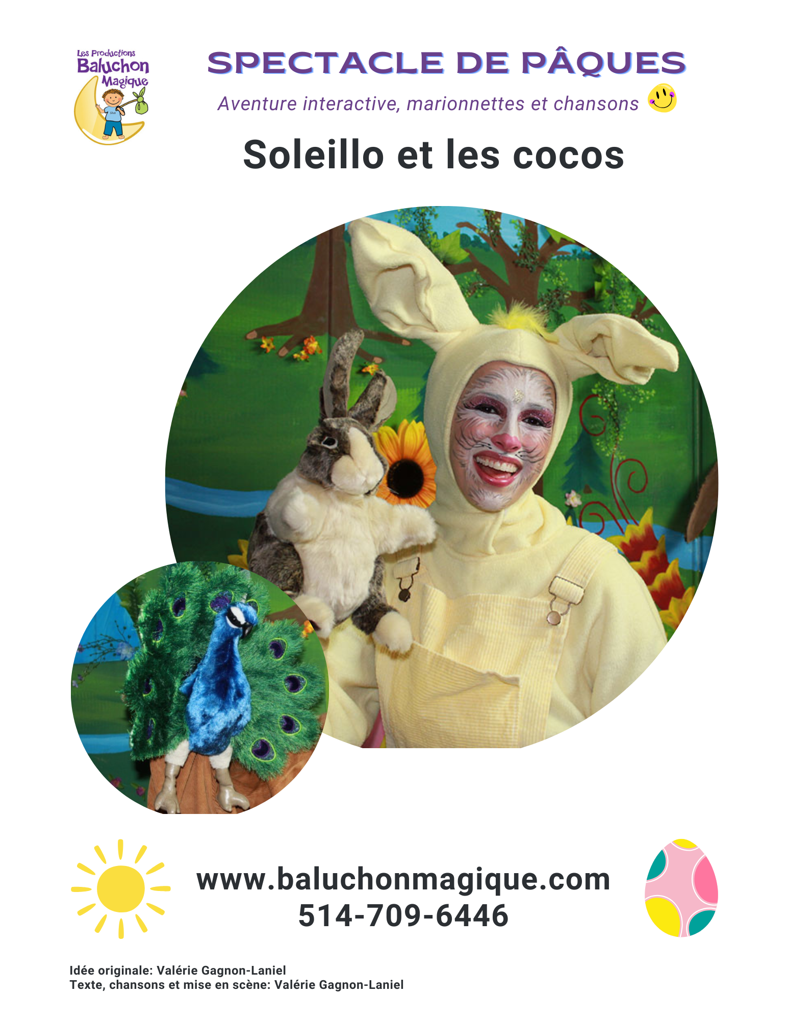 Soleillo, un lapin plein d’entrain, adore célébrer Pâques à sa façon; en créant des cocos uniques remplis de vœux inspirés par une ribambelle de personnages hauts en couleur. Sur sa route, il croise un furet farceur, un dindon sauvage un peu bougon, un paon timide qui cache un grand talent et un autre lapin qui lui ressemble mais pas tout à fait... Grâce à ces rencontres, Soleillo et les copains vont vivre une aventure rocambolesque où chaque coco devient le reflet d’un lien précieux!